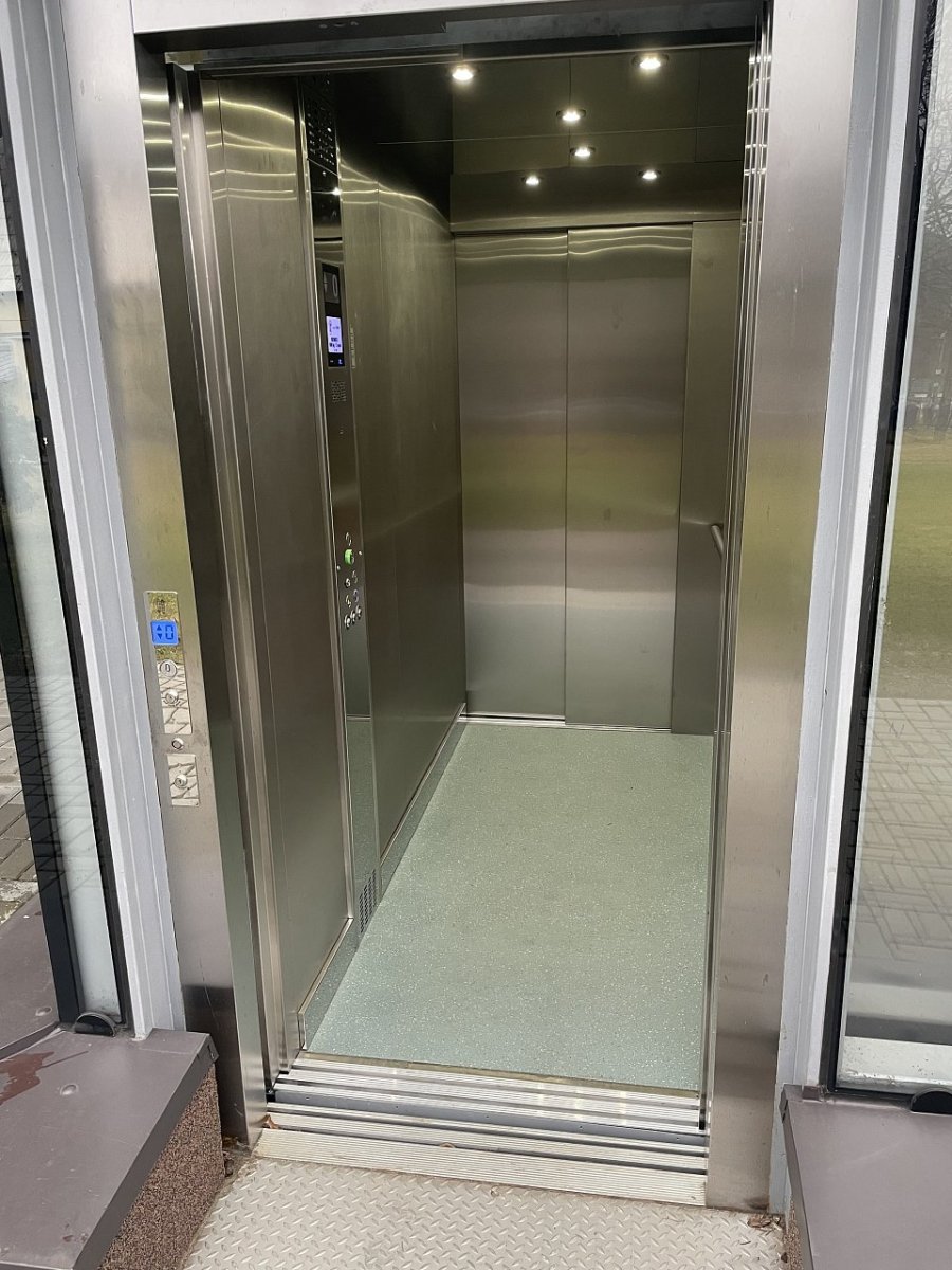 Venkovní bezbariérový prosklený výtah na základní škole v Raškovicích.
