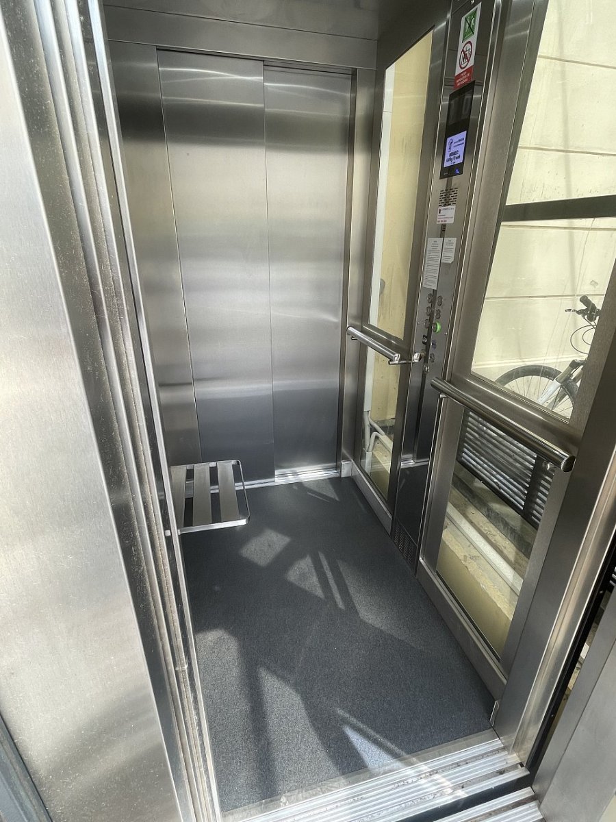 Venkovní bezbariérový prosklený výtah na Univerzitě Palackého v Olomouci.